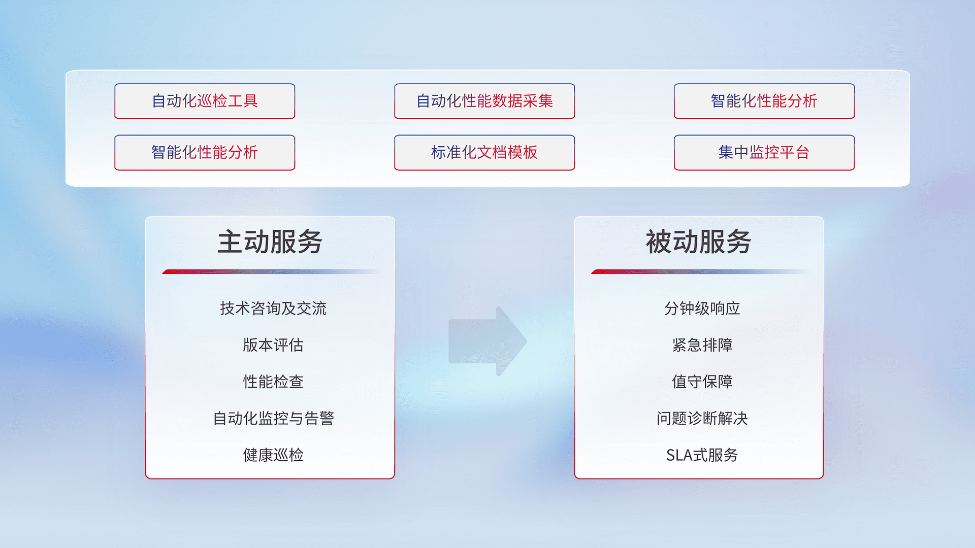 智能化工具和标准化文档,,,保障服务质量,,,,提供主动服务(包含技术咨询、、、版本评估、、、、性能检查、、自动化监控与告警、、、健康巡检)和被动服务包含(分钟级响应、、、紧急排障、、、、值守保障、、、、问题诊断解决、、、、SLA服务)。。。。