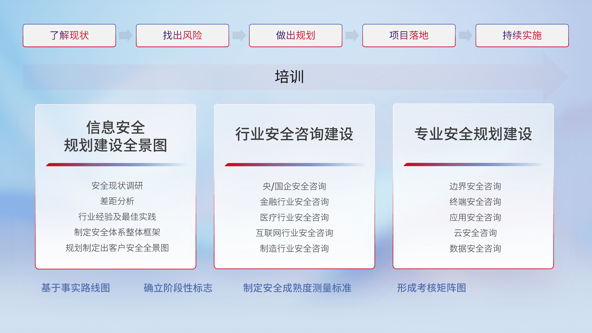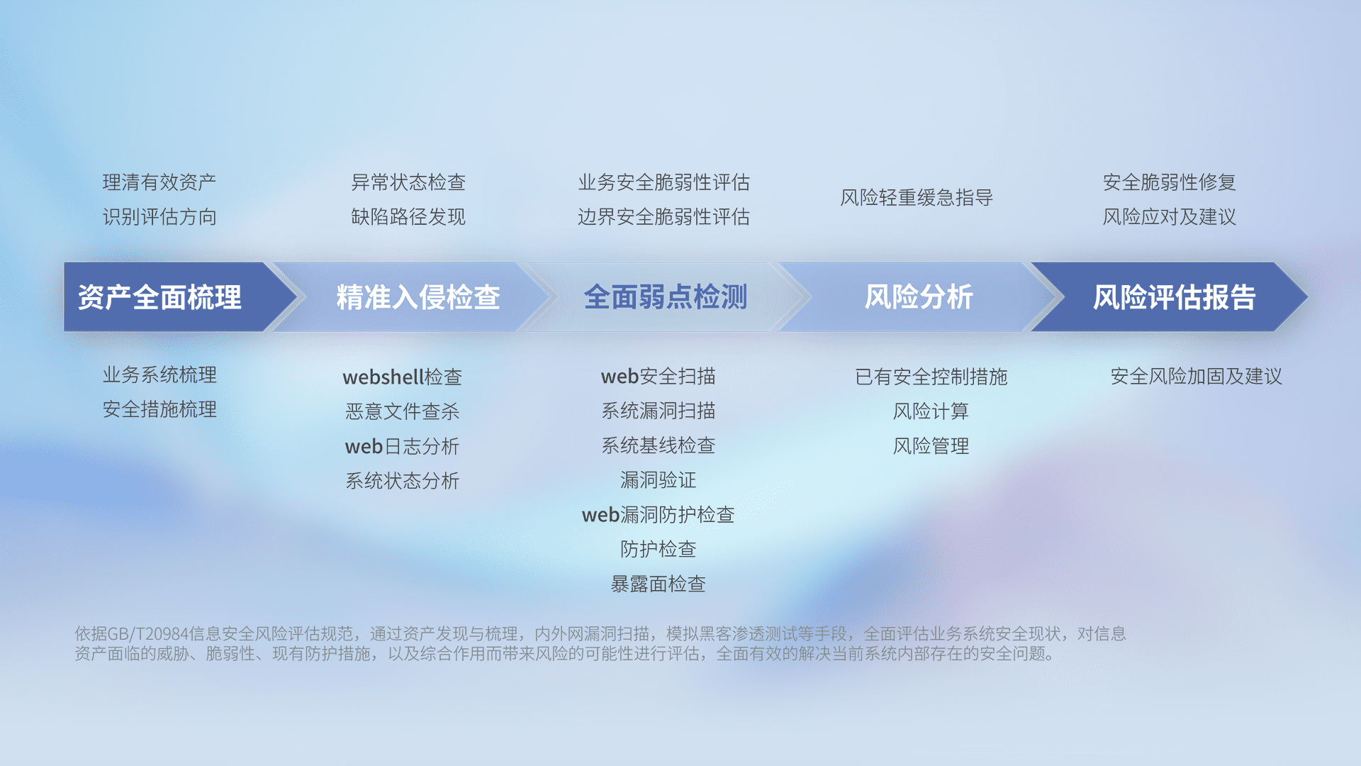针对客户行业特性,,以专业的安全服务+多厂商联合解决方案提供专属的一站式安全管理服务,,,帮助客户全面感知网络空间威胁,,基于识别、、检测、、分析、、、防护、、、、监测、、、响应的服务理论模型,,从方案咨询、、、、集成交付、、、评估验证、、、、优化加固、、、、运维运营,,致力于为客户提供完整的闭环管理式安全服务。。以实战经验为客户打造高抵御风险的安全体系,,,,帮助客户发现威胁、、、、对抗威胁、、、、处置威胁,,,,不断积累安全对抗能力,,,,持续保障数字化安全。。